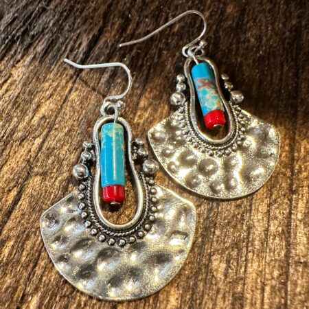 Boho Hippie Western Cowgirl Pounded Turquoise Stone Silver Drop Wire Earrings, Gift Box