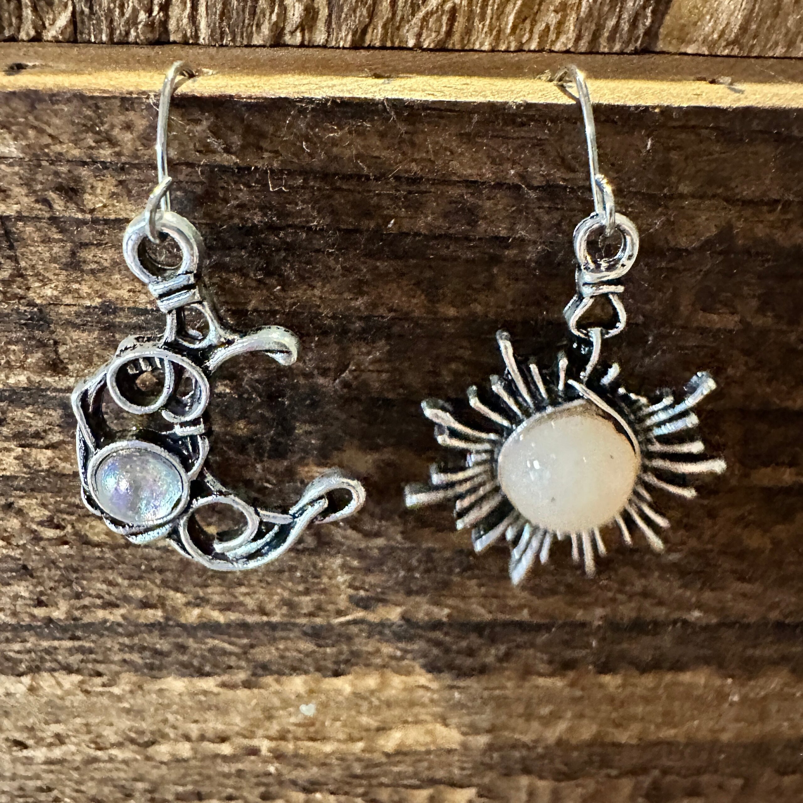 These silver earrings feature a unique boho hippie western sun and moon design with opal stone accents. Perfect for adding a touch of style and creativity to any outfit. Comes in a gift box for the perfect present.