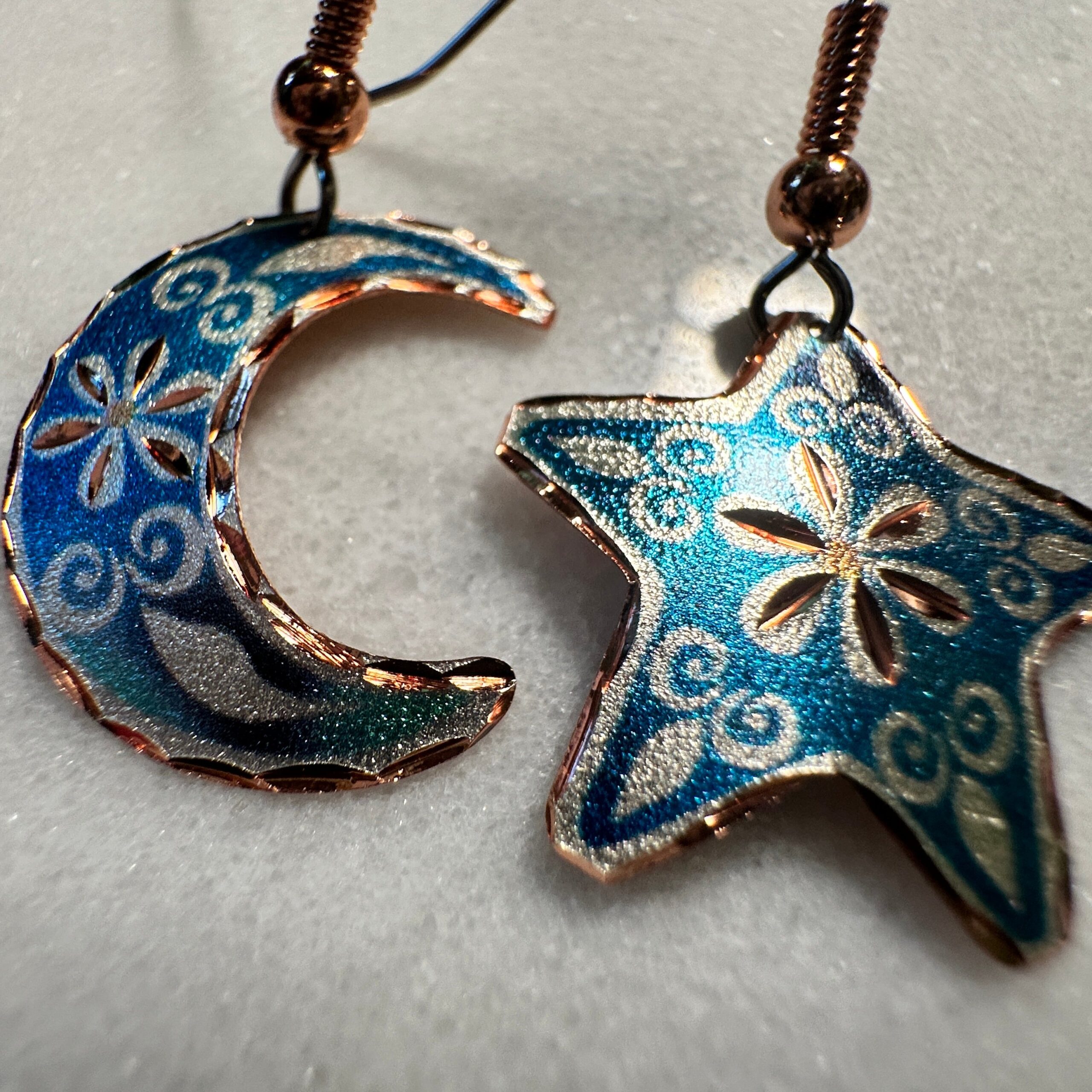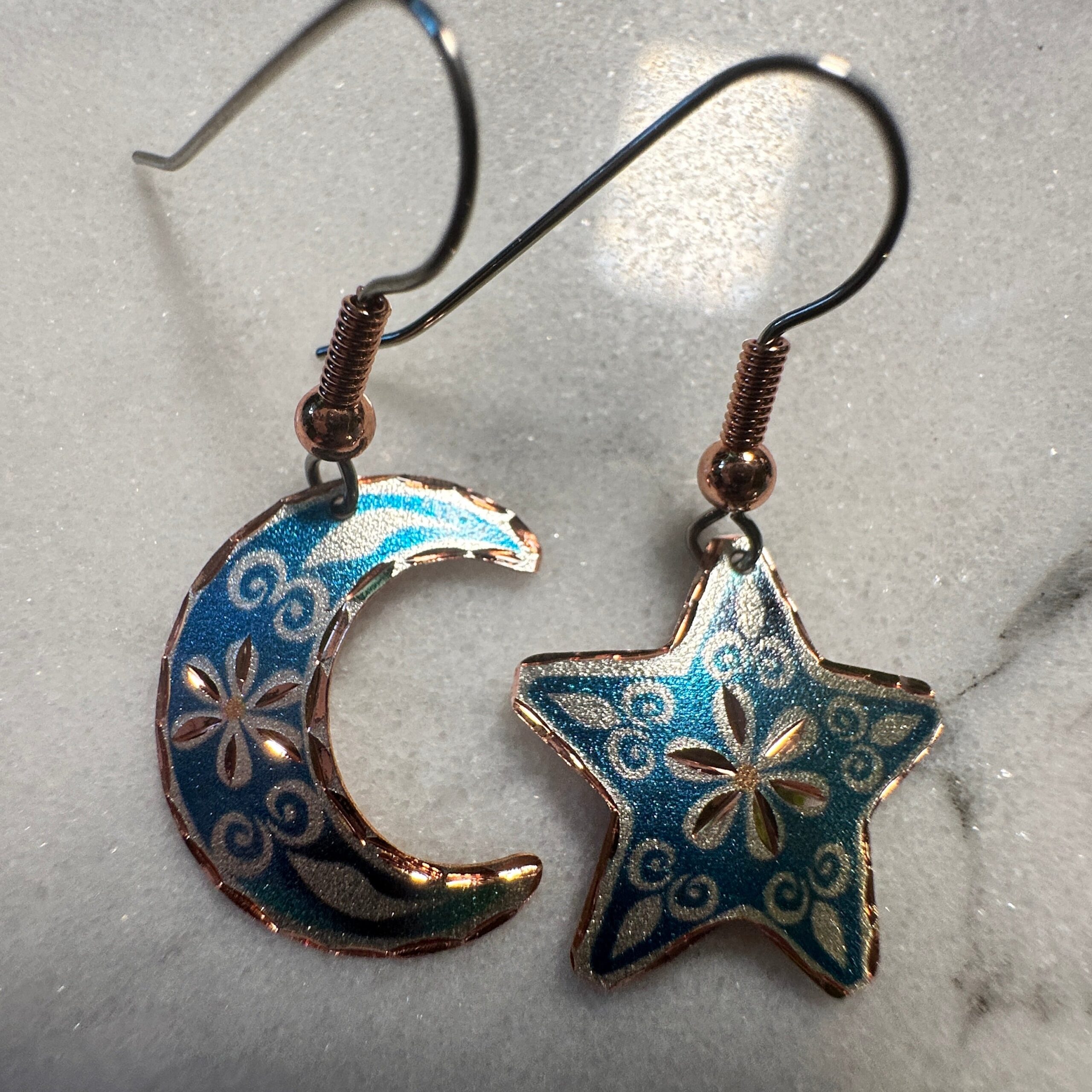 Expertly handcrafted, these copper earrings feature a stunning diamond cut design of a blue moon and star. With intricate wire drop detailing, these earrings are perfect for adding a touch of sophistication and style to any outfit. Elevate your look with these unique and elegant earrings.